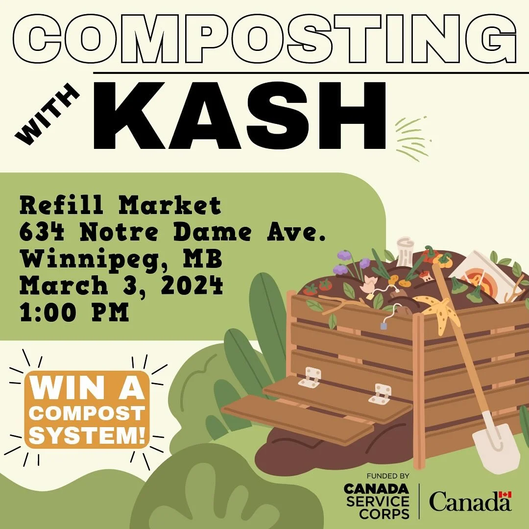 Kash hosted a composting workshop to empower his community in Winnipeg to combat the environmental impact of decomposition in landfills, right from their own kitchens. He also distributed at-home composters to local community members!